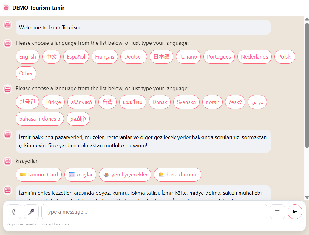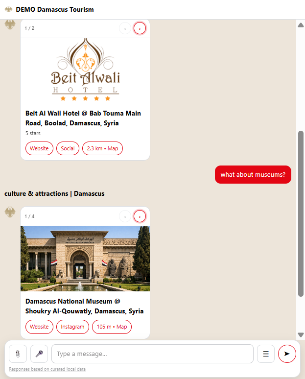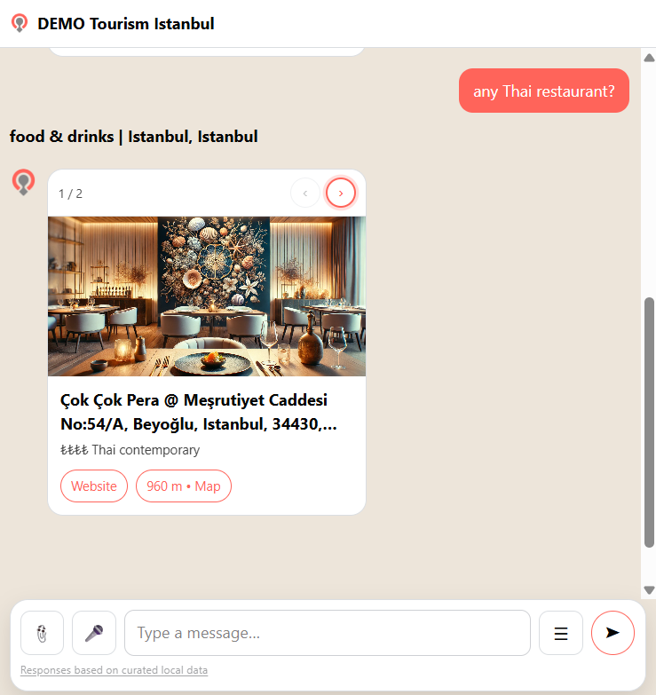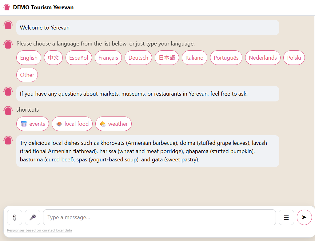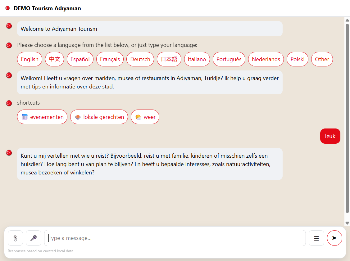 Please note: We have yet to add basic tourist data to the destinations listed here. The demo's for WhatsApp, LINE, Telegram and WeChat will first require to enter the city to search from.